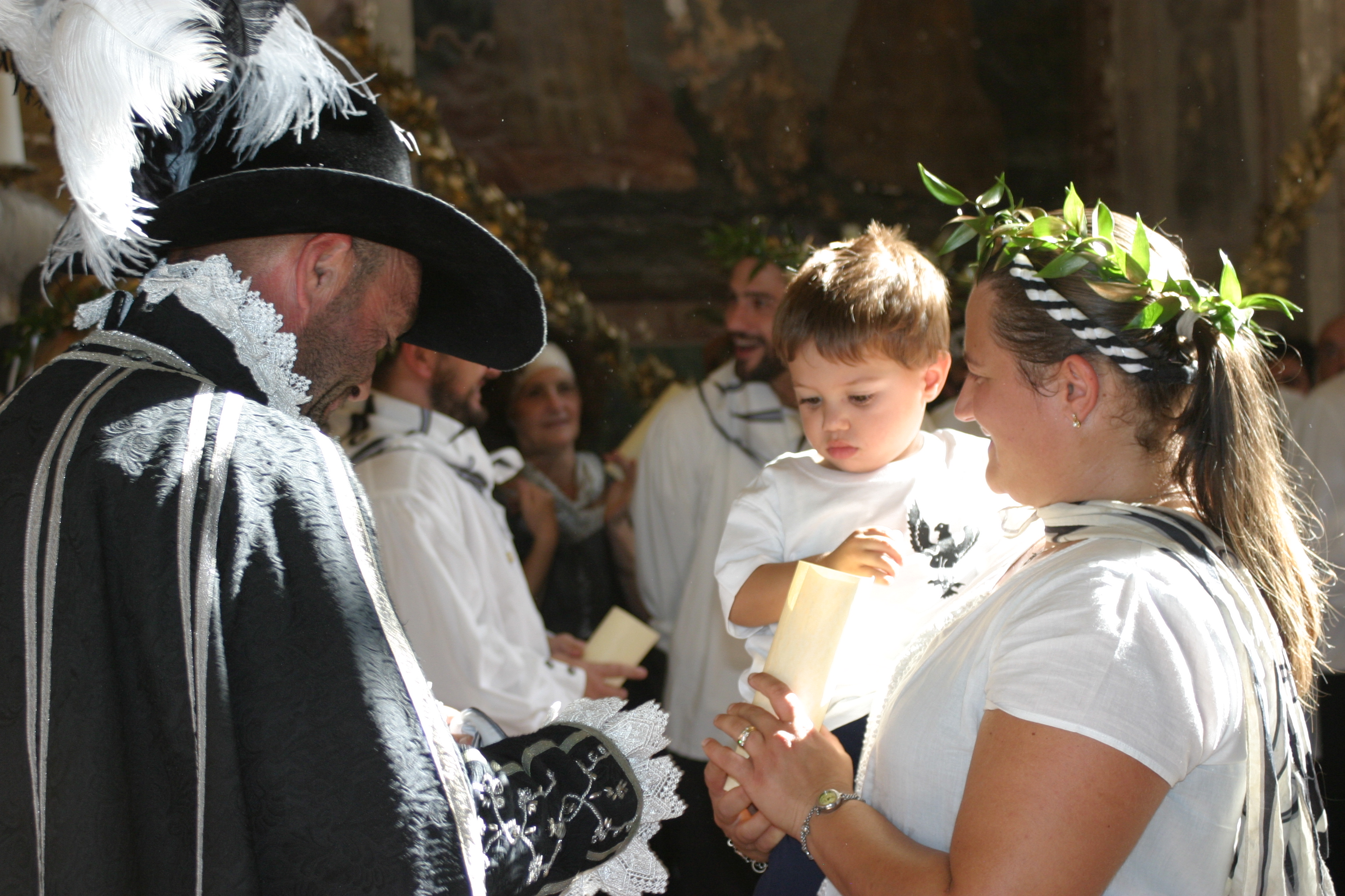 La vita di un membro del Rione è piena di tante “prime volte”, che vengono vissute soprattutto da bambino: la prima volta che si indossa il vestito da Popolano per poter dare una mano nelle serate di taverna; ancora più desiderata la prima volta che si entra in campo nella cosiddetta “gradinata”, cuore pulsante ed infuocato del Rione, per assistere alla Giostra; la prima partecipazione al corteo in costume seicentesco dove si rappresenta fieri la propria rappresentanza rionale. Sicuramente la più attesa “prima volta” è quella del primo palio vinto, quella che non verrà mai dimenticata. Tra tutti questi momenti ce n’è uno che ha un valore profondo, ha il sapore di una promessa a vita, simile ad un matrimonio con la persona che ami, un giuramento cui ogni Popolano orgogliosamente aspira: il battesimo rionale.