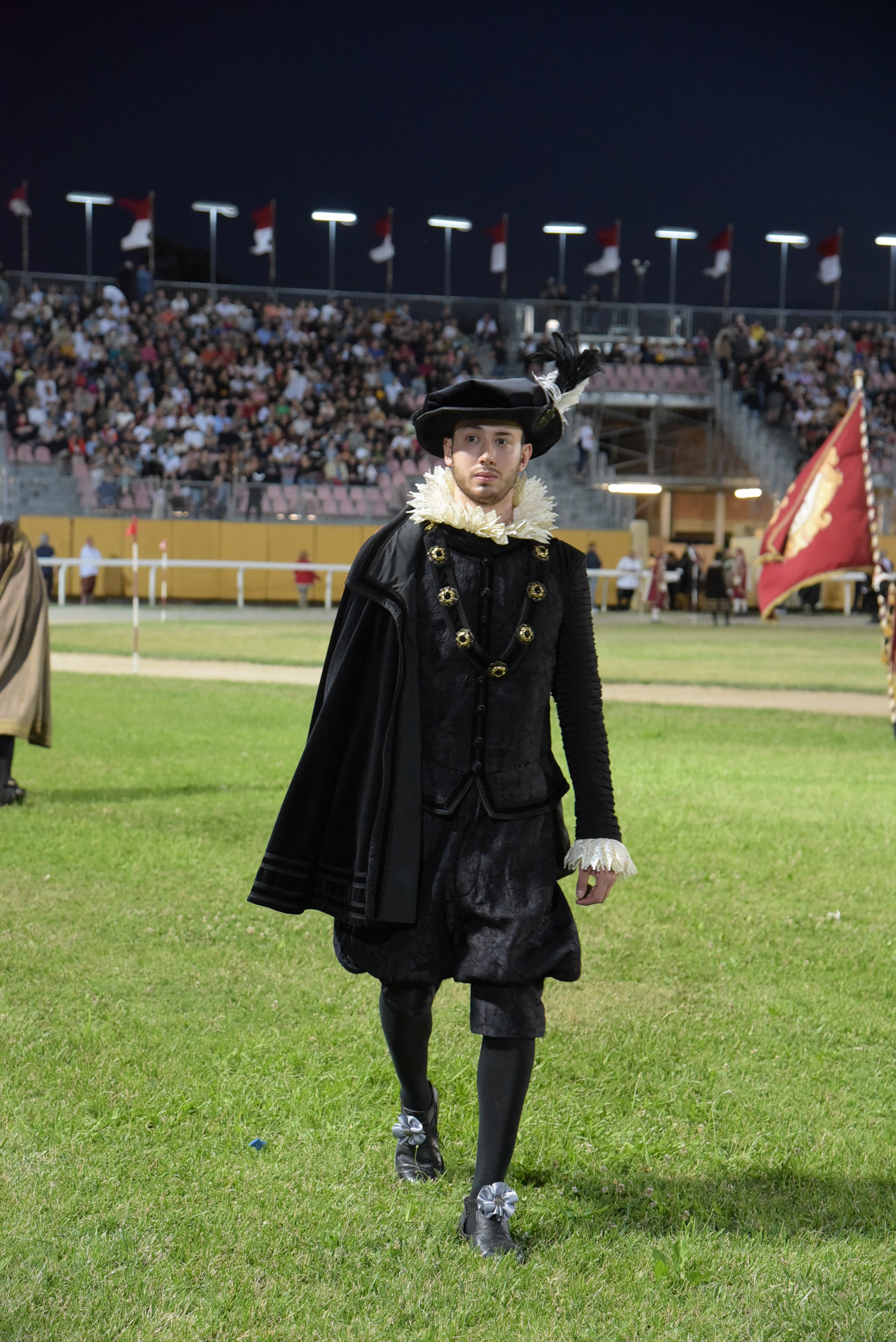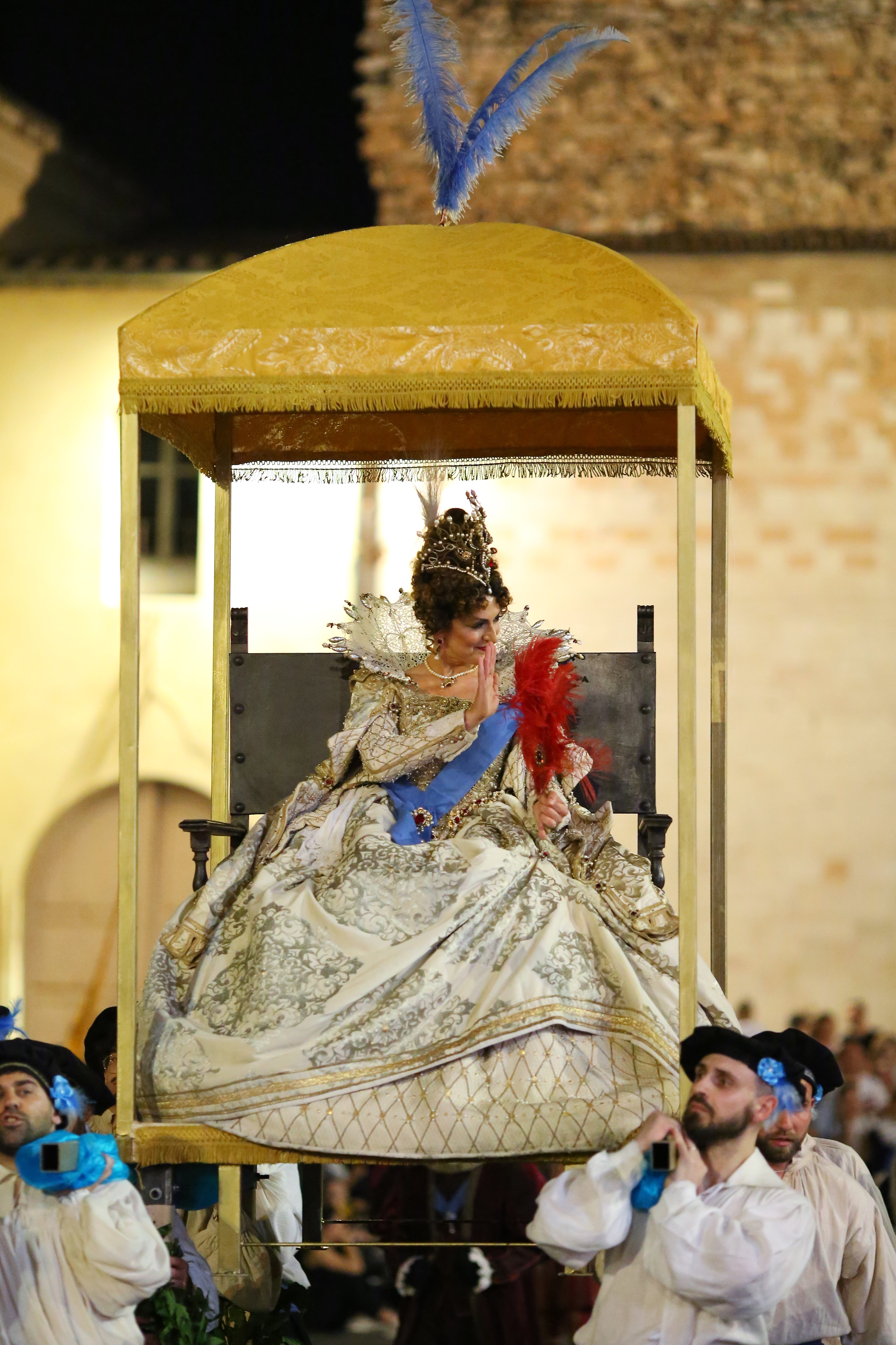 Mento alto, sguardo altero, sorriso accennato: quando si sfila non si presenta un abito, si entra in un personaggio, in un’epoca fatta di nobiltà ed eleganza. Procedere a passi lenti e sicuri sotto le pesanti gonne che ondeggiano, dentro a rigidi busti ti fa riflettere sulla condizione delle donne a quel tempo, sui tanti lacci stretti dalla società che le lascia a malapena respirare. Le donne di oggi sono molto più libere, nel modo di vestire e nello stile di vita, ma sono comunque “figlie” di quelle dame ed amano lasciare per alcune ore spazio ad un pizzico di vanità: il tempo sembra fermarsi, la frenetica routine quotidiana resta fuori dalle stanze della sede rionale, le persone intorno si muovono tra spazzole, cosmetici, diademi, gorgiere ed è impossibile non emozionarsi nel vedere i loro sguardi che cercano la perfezione in ogni dettaglio. Parola d’ordine: uscire in scena e dimostrarsi all’altezza del proprio ruolo, vivere a pieno un momento così unico e meraviglioso.