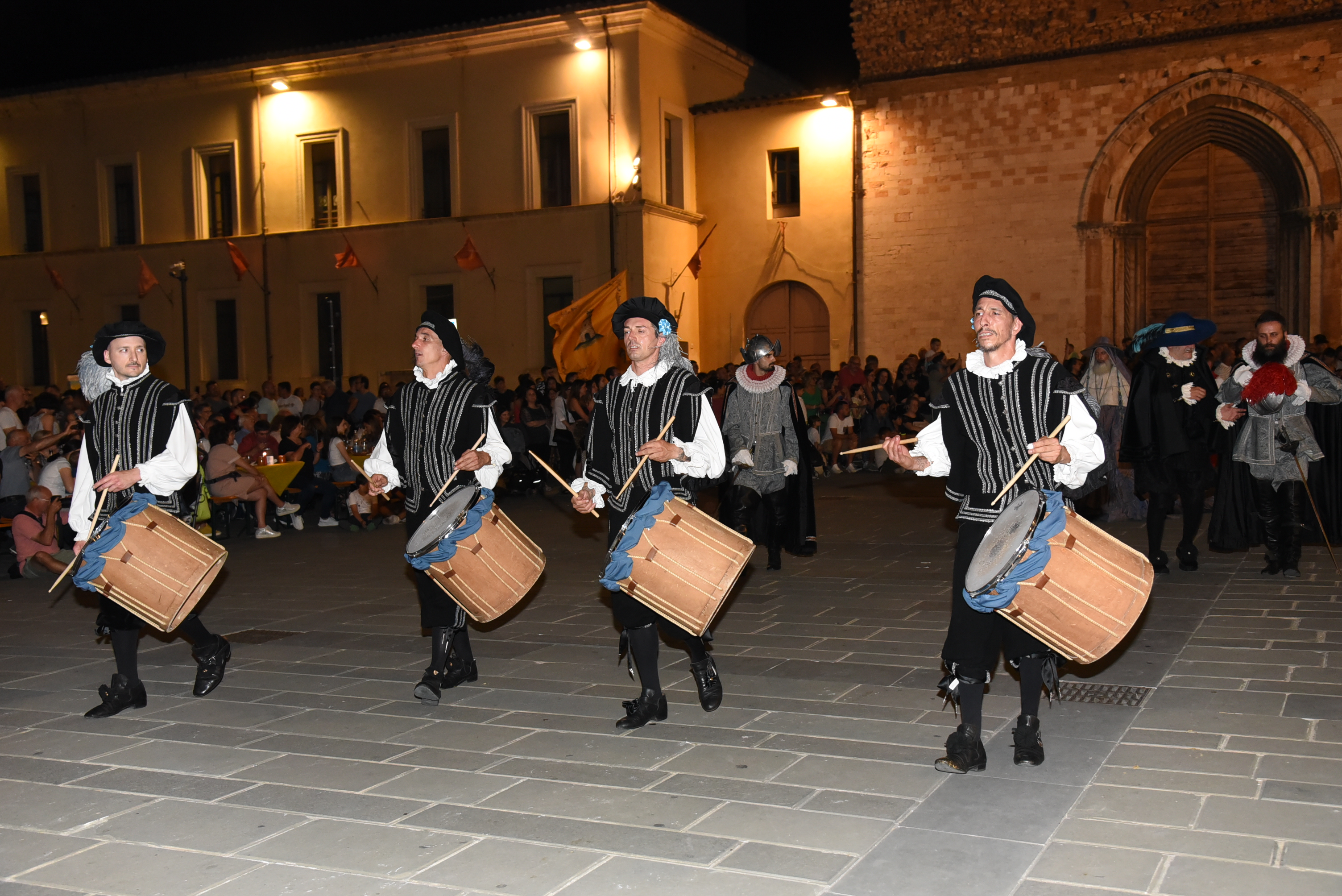 Il corteggio delle rappresentanze rionali in costume, detto tradizionalmente Corteo Storico, configura un momento unico nel suo genere, pieno di emozioni, divertimento e allegria, nel quale ci si mostra con fierezza dinanzi a tutta la città. Bellezza, eleganza, energia saltano agli occhi degli spettatori che osservano affascinati l’interpretazione scenica di quell’epoca ormai così lontana. Non si tratta di una semplice rievocazione, bensì di una particolare forma di spettacolo adottata nel 1946 per far conoscere e calare il pubblico folignate nell’epoca barocca, attraverso l’esibizione tra le vie principali della città, di personaggi emblematici del tempo, regalando a tutti gli spettatori una serata straordinaria.